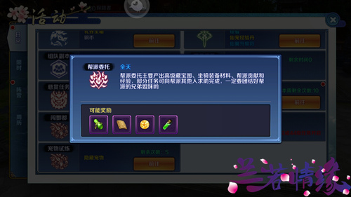 帮派委托可不是仅仅是让大家掏腰包,也是有丰厚奖励的。在帮派委托开启后,完成帮派委托可以获得藏宝图、坐骑装备材料、帮派贡献和经验。委托任务基本都是上交一些材料和特殊物品,每轮共10个任务。帮派任务除了基础奖励外,如果10个任务全部完成还会有额外奖励。