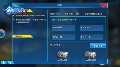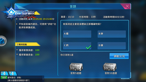 军团答题活动每天19:05~19:15开启,每次都有10道题。题目大多涉及一些常识问题,全部答对并不困难。每答对5题,就可以开启对应的宝箱,获得军团贡献和军团资金的奖励。不同正确数的宝箱,自然奖励也有所不同。
