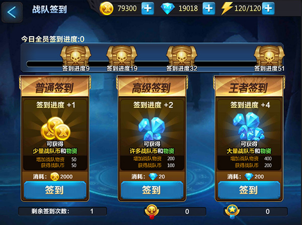 每位召唤师每天可以签到一次,获得一定量的战队币和战队物资。战队签到分为普通签到、高级签到和王者签到,不同的签到花费的金钱不同,获得的奖励也不同。战队物资可以用来提升战队等级和开启战队副本。