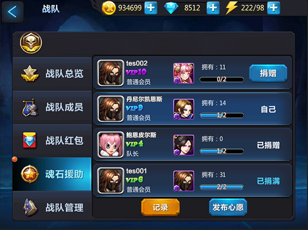 战队成员每天都有一次发布英雄魂石心愿的机会,获得魂石富余的战队成员的帮助。同样的,召唤师也可以给同战队成员捐赠魂石。