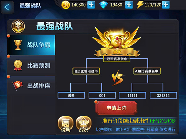 每周三、周六晚17:30 前,积分总数排在前四名的战队可以参加最强战队的争夺。每个战队将派遣10支队伍参加最强战队的争夺,分四轮进行,全程持续15分钟,对阵结果将在后台多次战斗生成,无需玩家操作。