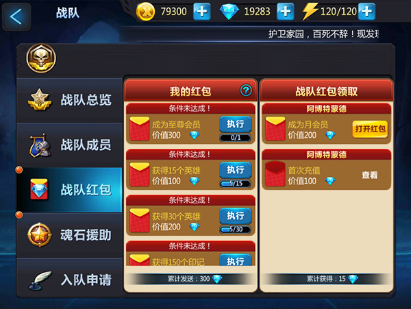 召唤师充值任意钻石金额都可以获得充值额度*10的钻石用于发送红包,战队所有成员都可领取本战队成员发送的红包。