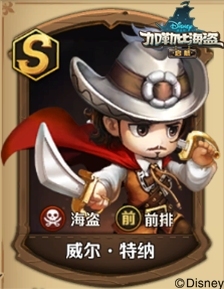 威尔•特纳(Will•Turner),鞋帮特纳之子,新一任“飞翔的荷兰人号”船长。威尔•特纳天性善良,尽管出身卑微,却极富冒险精神,虏获了伊丽莎白的芳心。早期作为铸剑学徒学习并掌握了不凡的剑术本领,战斗力不容小觑。