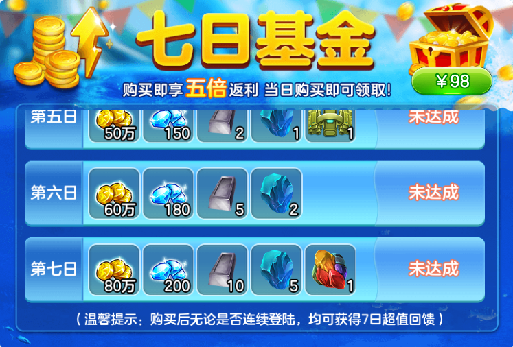 6、七日基金。这个就更加不要超值了,只要98元,五倍返利7天壕礼领回家。同样仅此一次,对于刚进入体验游戏的玩家来说,这个绝对不容错过,购买后7天奖励领不停。