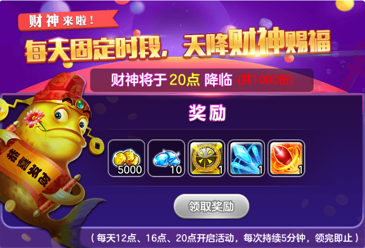 4、财神赐福。每天三个固定时段,财神赐福,纯福利,手快有手慢无,奖励多样,领到手软。