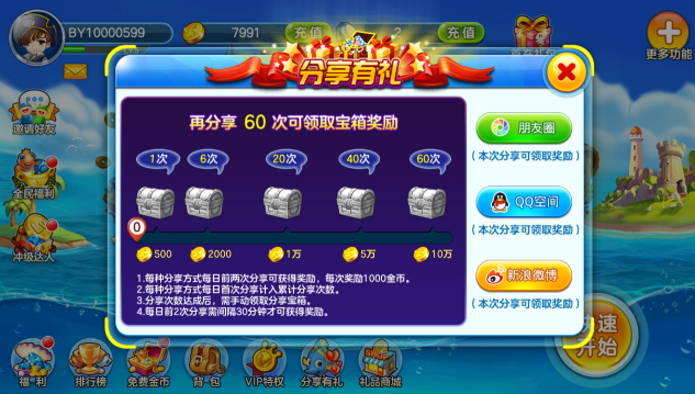 1、每日分享。玩家可通过朋友圈,Q~Q空间以及新浪微博分享游戏,每种分享方式每日前两次分享均可获得奖励,而累计达到指定分享次数还可领取宝箱奖励。累计可以领取二三十万金币。一键分享,奖励到手,就是这么简单,这么嗨!