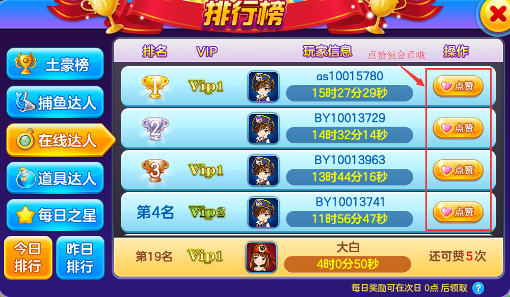 5、排行榜奖励。排行榜也是获取金币的一种来源,共分为5个榜单,奖励也是很客观的哦,当然这个排行榜奖励依靠玩家的游戏行为产生,奖励需要第二天领取,不过请注意,操作栏可以点赞哦,点赞即时领奖。朋友圈点点赞,只是动态已阅,排行榜点点赞,真金白银的金币送给你 。