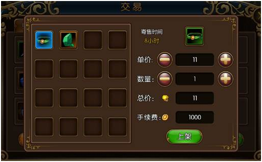 3. 在出售界面中会有5个解封的摆摊格子,点击格子则弹出上架界面,选择上架道具输入输入出售数量和价格后点击“上架”即可完成出售操作。