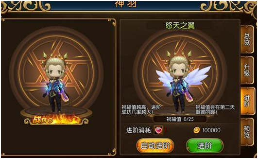 4. 进阶是神羽养成的另外一种方式,进阶神羽需要学号道具“进阶之石”和金币。