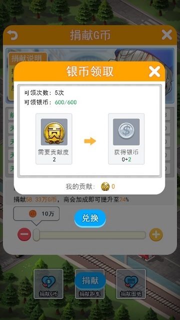 在商会中捐献G币,即可获得商会贡献来兑换银币,每日可以领取5次。1点贡献可以兑换1个银币,贡献越多,单次兑换的银币也就越多。升级公司财务部,可以提升单次兑换银币的数量。升级主角银币管理技能,可以提升每日领取次数。商会贡献决定了最终的银币领取数量,提升兑换次数只是加快了硬币兑换效率,所以,想要获得更多银币,在商会中多多捐献G币才是王道。