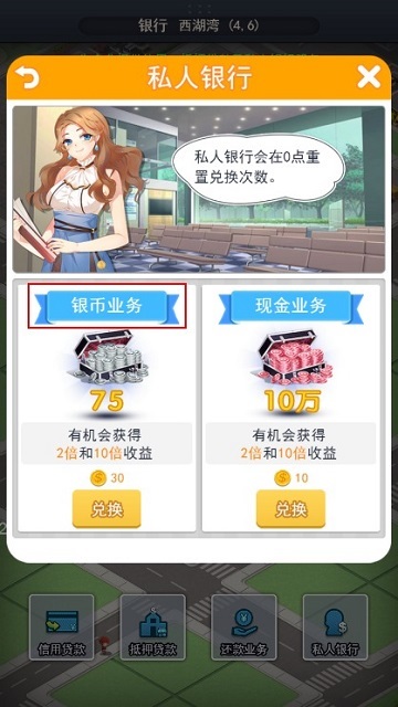 在私人银行,玩家可以使用金币兑换银币,初始兑换比例为1:2,兑换次数越多越优惠。因为只能使用金币兑换,所以除了急用的情况外还是不要轻易兑换的好。