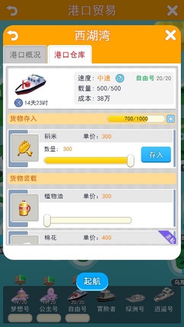 另外,在梦想岛上还有一个小仓库,能存放一些货物。如果贸易时刚好路过梦想岛,岛上又正好有比较便宜的重金属、棉花、塑料之类的货物,可以多买一些把仓库存满,下次贸易再顺路经过梦想岛的时候取出来卖掉,也算是一小笔额外收入。不过每天的航行次数很宝贵,如果专门去仓库存取货物就不划算了。