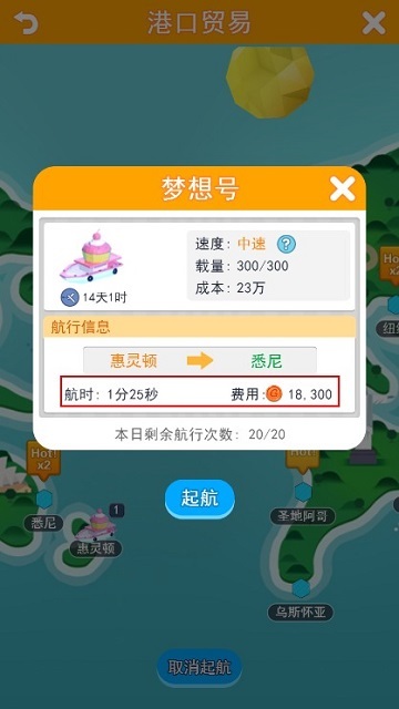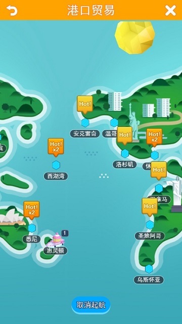 买定好货物后起航,地图上会有一些hot、hot×2、hot×3的标志,数字越大,卖价越高(并不是指利润2倍、3倍,不要误解)。尽量找hot×3的港口去卖,没有hot×2也行。出航前,记得看看航行时间和费用,二者都不能过高,要是一趟航行就要花费上百万,多少利润都跑没了。