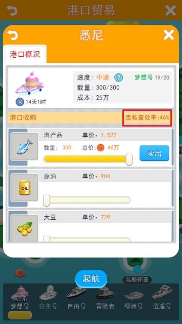 不过,走私交易的情况下有一定机率货物会被没收,损失惨重。走私没收率各港口不同,一般在30%-60%之间浮动。这里有一个走私的小技巧:卖货时不要一次性卖光,要分成几个批次进行小额买卖,这样能平摊风险,不至于运气不好一下全没收了。