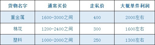 上述表格中,还有一列显示货物的走私价,价格很低很诱人!走私的货物如果能够成功卖出,平均利润就可以翻倍,收益非常可观。