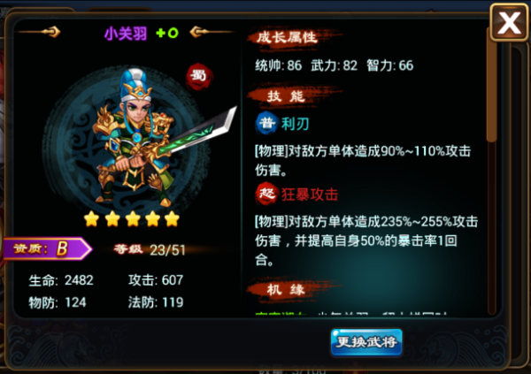 上面已经说明了普通的技能了,还有机缘系统还有天赋,带来的附加效果简直神技。总的来说,小关羽是一个十分强大的新手级物理系英雄,搭配貂小蝉,可以发挥奇效益。