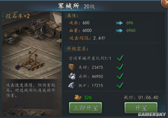 军械可以通过升星来提升其属性,通过消耗一定的物资来增强军械的属性。