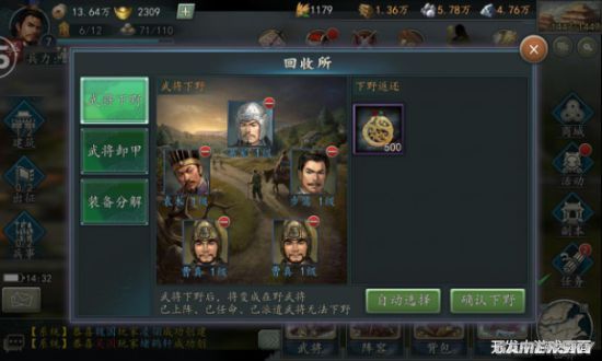 当玩家手里有多余没有使用的武将或者是进行武将的更新迭代时,在回收所下野或者卸甲武将是一个很好的去处。下野完整的武将将获得信物、经验书以及升星过程中消耗的材料。武将品质越高,下野获得的信物越多,经验书及升星材料受武将培养情况影响。卸甲武将将获得经验书、升星过程中的消耗材料以及初始状态的该武将。分解和下野过后武将穿戴的装备都会自动卸下并放入背包中。