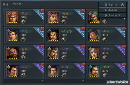 在主界面下方菜单栏中点击“武将”,即进入武将列表页面。该页面将会默认以武将等级为依据,由高到低展示玩家所拥有的武将谋士。点击右上方向下箭头,可将武将卡按不同方式(品质、等级、兵种)排序,已经在队伍中的武将会始终置顶显示。
