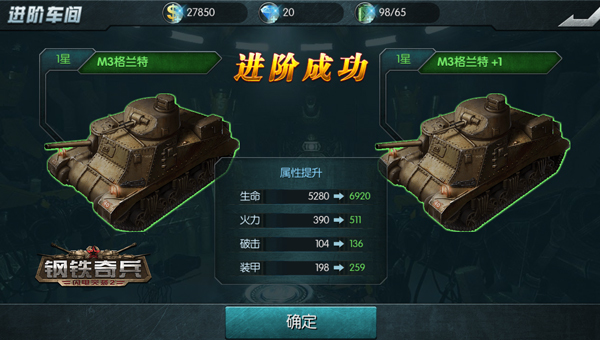前期使用的第一辆坦克为“M3格兰特”坦克,是自行火炮型坦克, 5mm榴弹炮的火力在战斗中非常优秀,有概率向随机单位投放小型榴弹,稳定的机械性能也令其生命力大幅提升。接下来的关卡会越来越难,所以需要升级坦克,使其能挑战更强的轴心国坦克。需要对坦克进行进阶升级,新手提示会进入该界面。(前期的进阶材料比较好打,可以反复的刷对应的关卡获得进阶材料,新手进阶坦克后,战力会大幅上升,能更容易的通关普通副本,抗住英雄关卡的打击,获得更高星级的坦克碎片),前期建议优先进阶重型坦克(只有你的防坦够硬才能三星过关)。