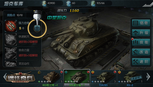 当然,坦克也有专属核心技能和普通技能。每进阶一定等级会依次解锁技能,每辆坦克都有专属的4种技能,随着进阶等级提升不断升级。技能点为每5分钟恢复一点。别忘记点它,这是增加战力的有效方法。