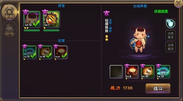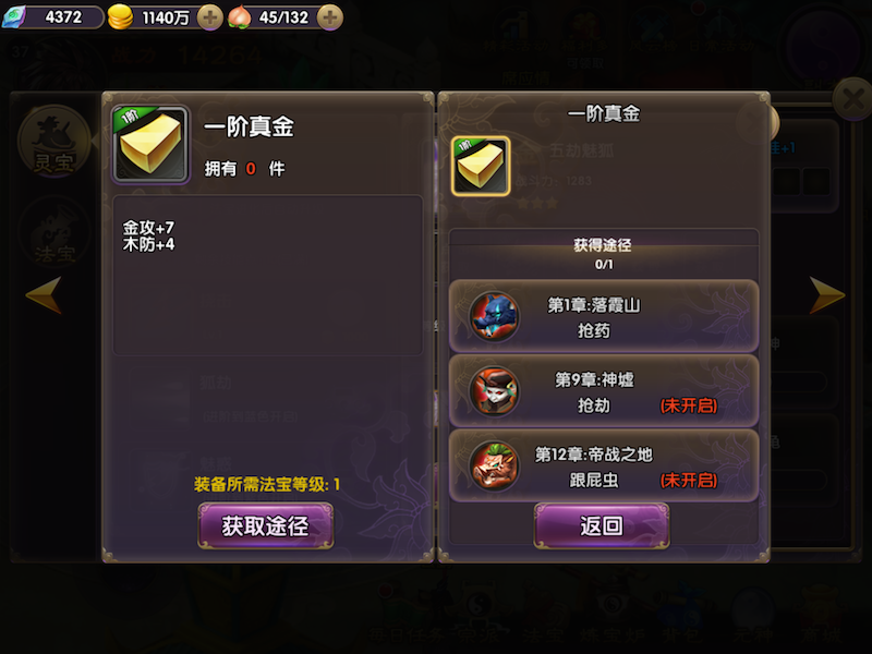 法宝进阶:装备齐法宝对应装备,可以升级法宝品阶,提高法宝的品质。法宝装备可以通过副本通关奖励获得,点击获取途径可以直接跳转到可以产出该法宝装备的副本。