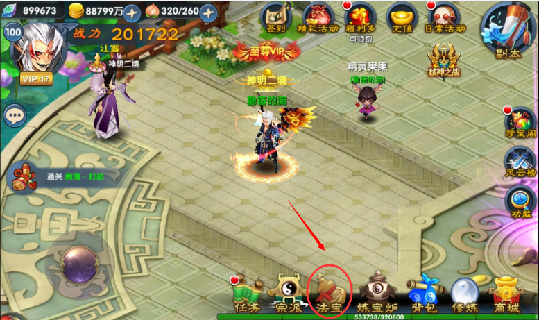 法宝升级:法宝可以通过通关副本和直接喂食法宝经验丹药升级,法宝经验丹药升级更快,法宝经验丹药可以通过珍宝阁购买获得。