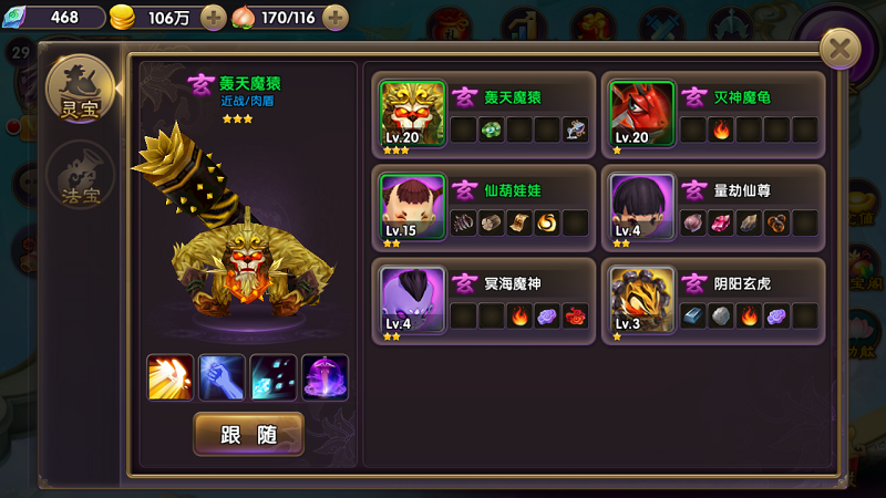1、法宝分灵宝和法宝两系,灵宝可协助出战并携带可释放天赋技能,部分灵宝可以使用变身技能,变身为灵兽并获得全新技能。