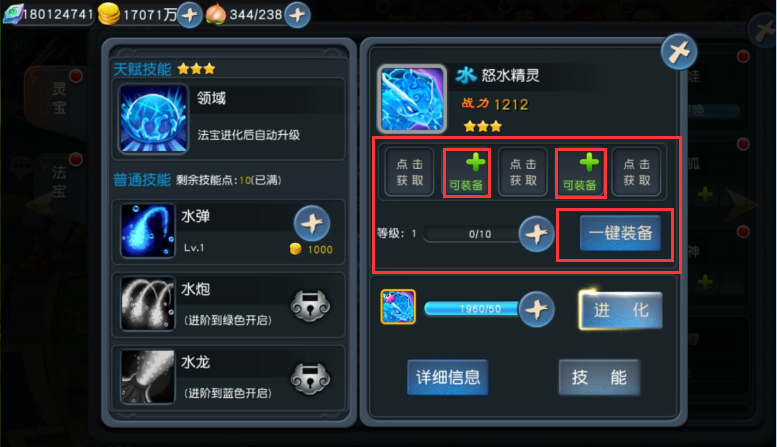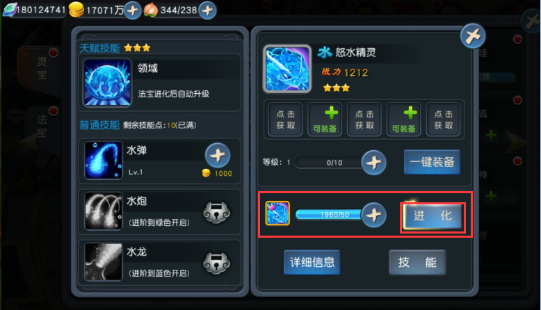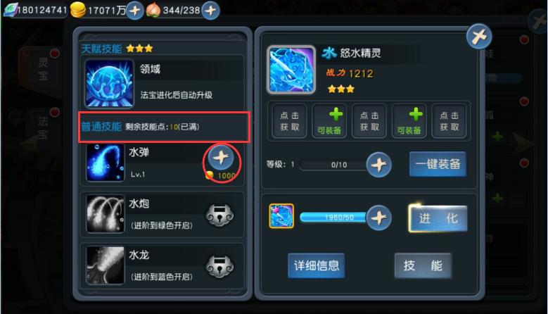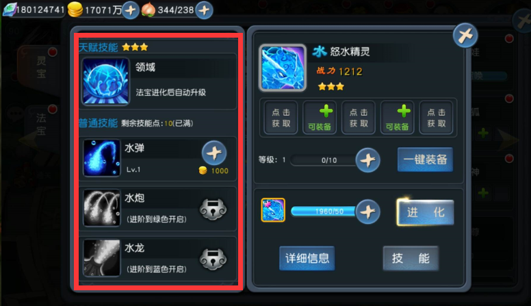 技能升级:每次法宝升级可以获得技能点,道友可消耗法宝技能点和少量金币,为法宝的普通技能升级。