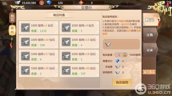 其次,由于在不久前的新版本中,开放了流通银两交易功能,在交易行中,除了通过上架装备贩卖以外,花费少量钻石进行流通银两的购买也不失为一种更加快捷和高效的方式。
