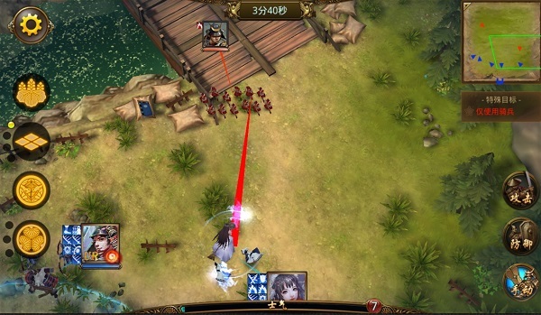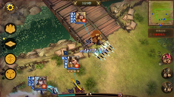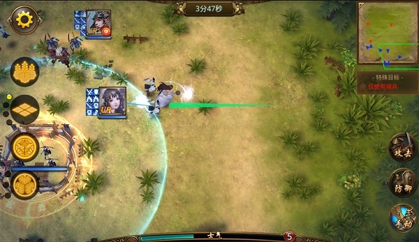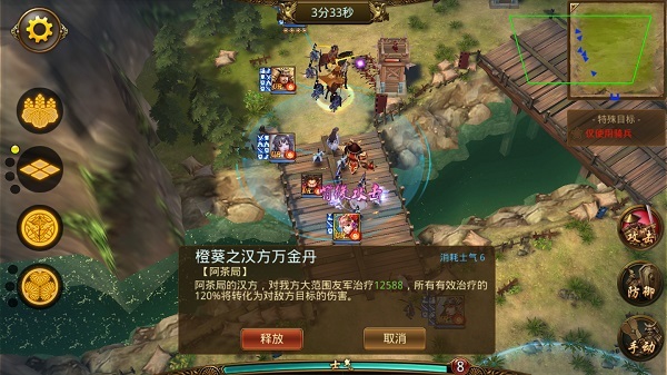 在战斗中,部队的进攻分为普攻攻击和战法攻击。普攻不用多说,技能攻击则是每个武将能够释放自己独有的技能来攻击敌军。当己方部队的士气值攒满时,点击己方部队即可弹出技能释放状态;手动选中技能攻击方向,点击“确定”选项,己方武将就会释放战法。