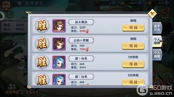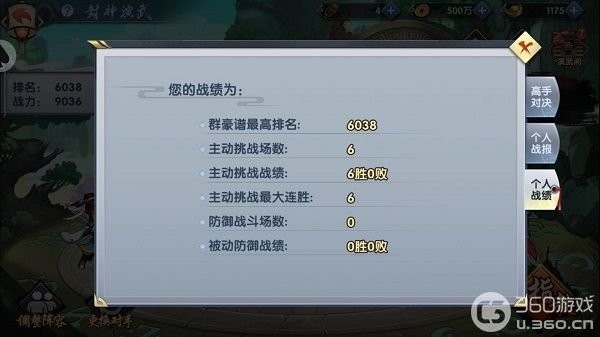 在封神演武界面,点击【战报】可通过录像对高手对决、个人战报查看精彩的战斗进行回放,同时可在个人战绩处对当前自己的挑战成绩进行查看。