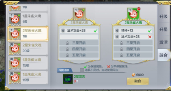 最后我们来说说圣魂的融合,圣魂融合能让圣魂的附加属性进行融合,比如两个只有一条附加属性的2星圣魂融合后会变成两条属性的2星圣魂,继承多条附加属性,但是2个1星圣魂由于没有解锁条目,融合后还是只能一条,所以这种做法是不可取的~在合成下方也会提示哪些属性能保留,哪些属性不会保留,各位合成是一定要看自习哦~