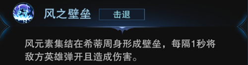 希蒂最主要保命技能,对于斯图、席拉等刺客有非常好的防御效果,要注意使用的时机,最好在敌人快接近自己时释放,因为该技能释放有短暂延迟,主要用法是防止刺客的切入,还有用来留住敌人(在敌人逃跑的路上使用可以起到阻碍作用)和守塔(在敌方兵线已在攻击我方塔时先开启该技能把小兵全部推出塔外再攻击小兵,可以很有效的守住塔),不要忘记该技能也会造成伤害,该技能在清兵、清野时主要用来提供伤害。