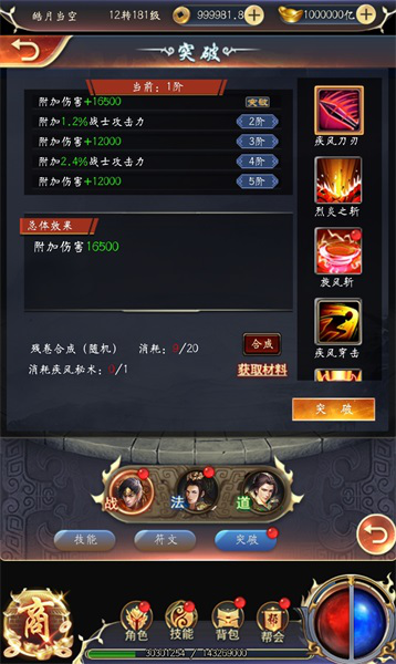 每个技能都可以突破五次,技能突破等级越高可获得更多的属性加成,极大的提升角色的战斗力。