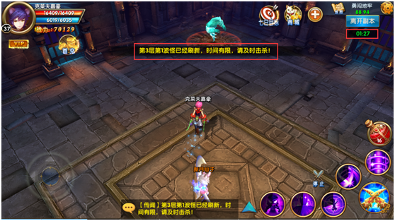 玩家在地牢副本里,必需赶在倒计时间为零前,清处完本层的6波全部怪物,否则将以失败告终退出副本。