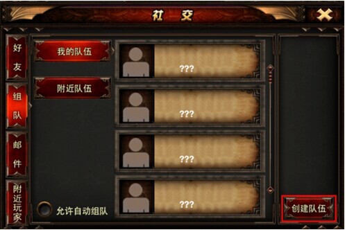 创建队伍:点击个人头像,打开游戏主界面下方菜单栏,点开“社交”项,选择打开组队面板,点击创建角色按钮即可。 组队方式:玩家第一次进入游戏,就可..