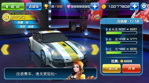 除了购买跑车之外,你还能自己亲自动手改装赛车,每辆跑车的性能都有所不同,最高时速、加速能力、过弯能力都能进行改装,每项属性均能升级到15级。当升级至满级之后赛车性能会大幅度的提高,对比赛也会是一个飞跃。