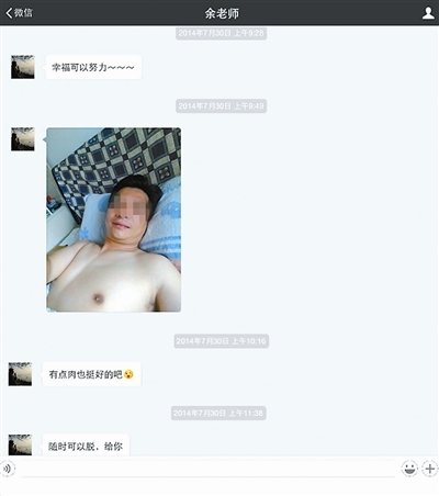 王静向北青报记者出示的通讯记录显示,名为“余老师”的人将一些私照发送给她,其中还有王静的私照。在聊天记录中,“余老师”称王静为“老婆”。