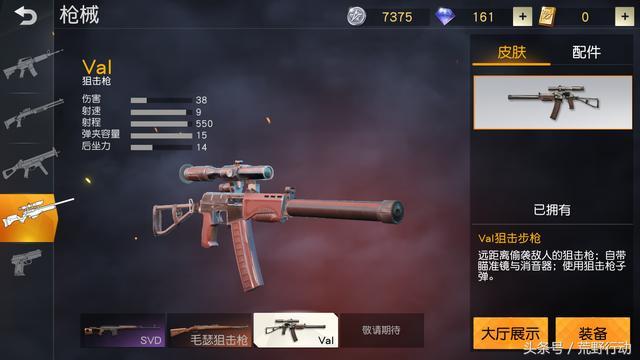 第一个是连狙Val,它作为狙击枪只有38点的伤害,是不是就看不上它了?那你可能会失去一件“神器”,Val虽然伤害低,但是自带四倍镜和消声器的特点,让你开局就能做LYB,享受阴人的快感。