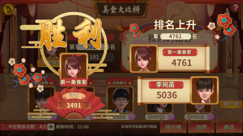 在美食竞技比赛中,玩家需要在排行榜中选定其他玩家进行挑战。获胜后,会与对方互换排名。层层过关斩将,拿到美食竞技场冠军的那位玩家,无疑将会成为撼动美食界味觉巅峰的厨神大佬!