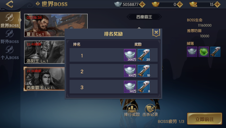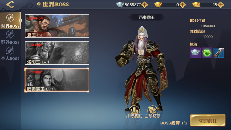 世界BOSS包括夏王,洛阳王,西秦霸王。玩家可以根据自己的战力和等级选择挑战。