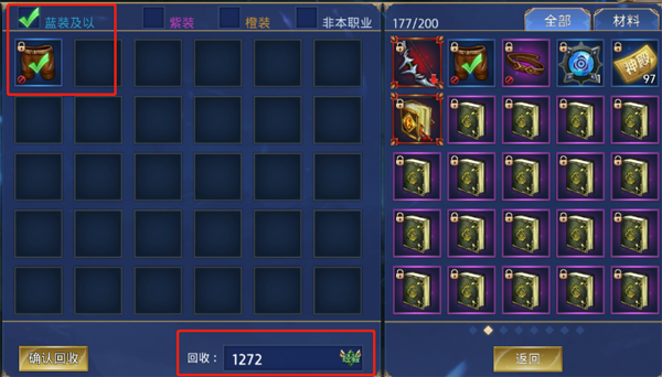 装备回收按钮就在个人背包界面的右下角,点击进入装备回收界面,会自动选中背包中的蓝色装备,同时中下部会显示回收这些装备后,会获得多少经验,例如我回收一件1级蓝色护腿,会得到1272点经验,差不多是我在危险地下城开5倍经验卡杀一只怪的经验,还不错,1级紫色项链回收择有2863点经验,也就是危险地下城5倍经验卡之后2只怪的经验了,80级紫装一件则有1w多经验,简直是前期升级利器。