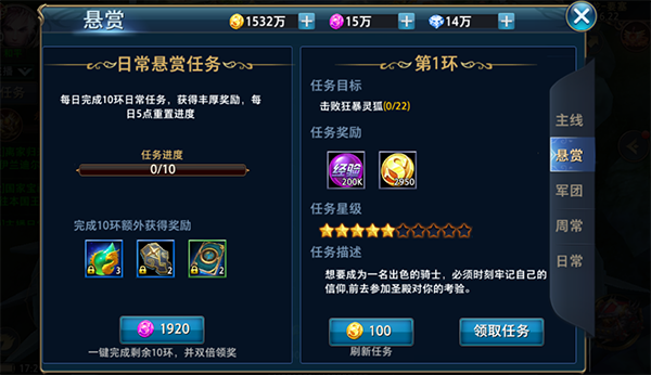 每日必做任务可通过主界面左侧的任务按钮查看,共分为五部分,分别是主线、悬赏、军团、周常、日常。主线任务衔接紧密,有变身刺探、救人、传递信息等多种玩法。悬赏与军团任务为每日10环,全部完成后可以获得额外奖励。
