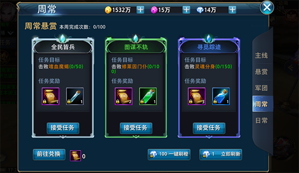 周常任务每周可以完成100次,完成方式有三种,等待任务时间倒计时结束、完成任务目标、花费钻石直接完成。无论采取哪种方法,完成任务后都可以获得经验药水以及商卷,商卷可以在王城的商人处兑换宝箱。