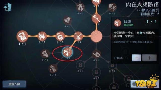 耳朵是监管者的一个天赋.学名耳鸣,在人格里面长这样,需要5点点数将它点出来: