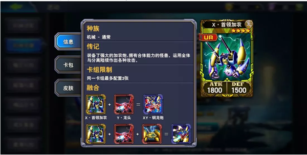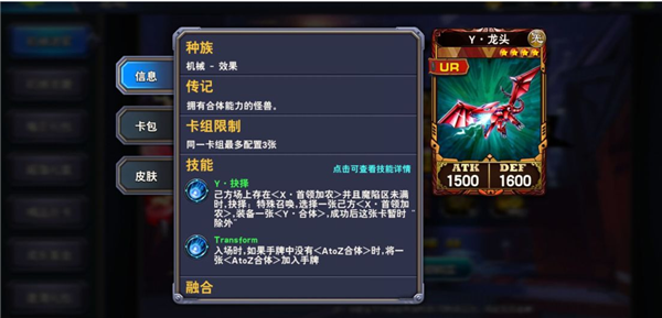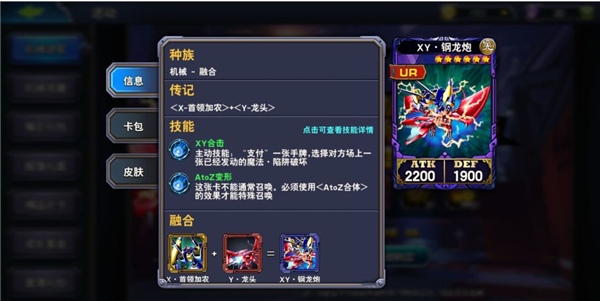 y龙头,作为融合(三巨头)之一的机械,攻击防御并不卓越不过却有些优秀的特殊效果~如果场上有加农炮可以抉择特殊召唤选择一张 自己场上的加农炮给它装备一张y合体成功后这张卡暂时除外。第二个特殊效果如果手牌没有atoz合体时候可以把一张atoz加入手牌效果真的是溜到不行,它可以跟加农炮合体也可以跟z合体,当然这里还没有出z这个卡我们可以期待一下~