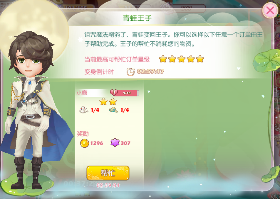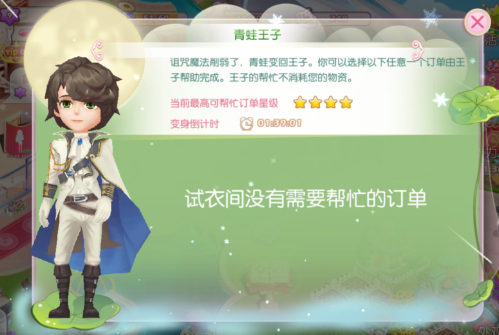 最后给大家普及一些信息2星订单在试衣间里的等待时间是4个小时,3星订单在试衣间里等待时间是8个小时。根据青蛙王子可以帮你的时间段,和订单可等待的时间段来合理安排试衣间的使用,才能让青蛙王子的利益最大化哦!你还在等什么快去完成订单吧!