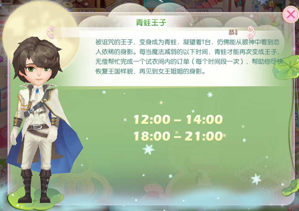 青蛙王子还会魔法啊,就是帮我们免费完成一个明星订单,但是有时间限制。每天12:00~14:00和18:00~21:00 这两个时间段内会免费为你完成一次明星订单(到时间青蛙真的变成王子了哟),但对订单的星级有一定要求。。