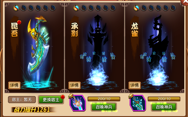 神兵可以进行洗练,没把神兵均有不同的三个属性和一个神兵技能,以昆吾为例,它拥有【生命】【攻击】【暴击】3个属性,神兵技能为【天怒】:每击杀一名敌人,额外获得10点怒气